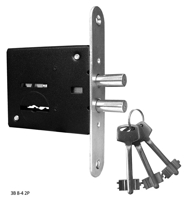 Врезной сувальдный замок ЗВ8-4 2Р с двумя цилиндрическими ригелями. Диаметр ригелей 10 мм. Предназначен для установки в деревянные и стальные двери толщиной до 50 мм. Комплектуется 3-мя ключами, ответной планкой и двумя накладками.